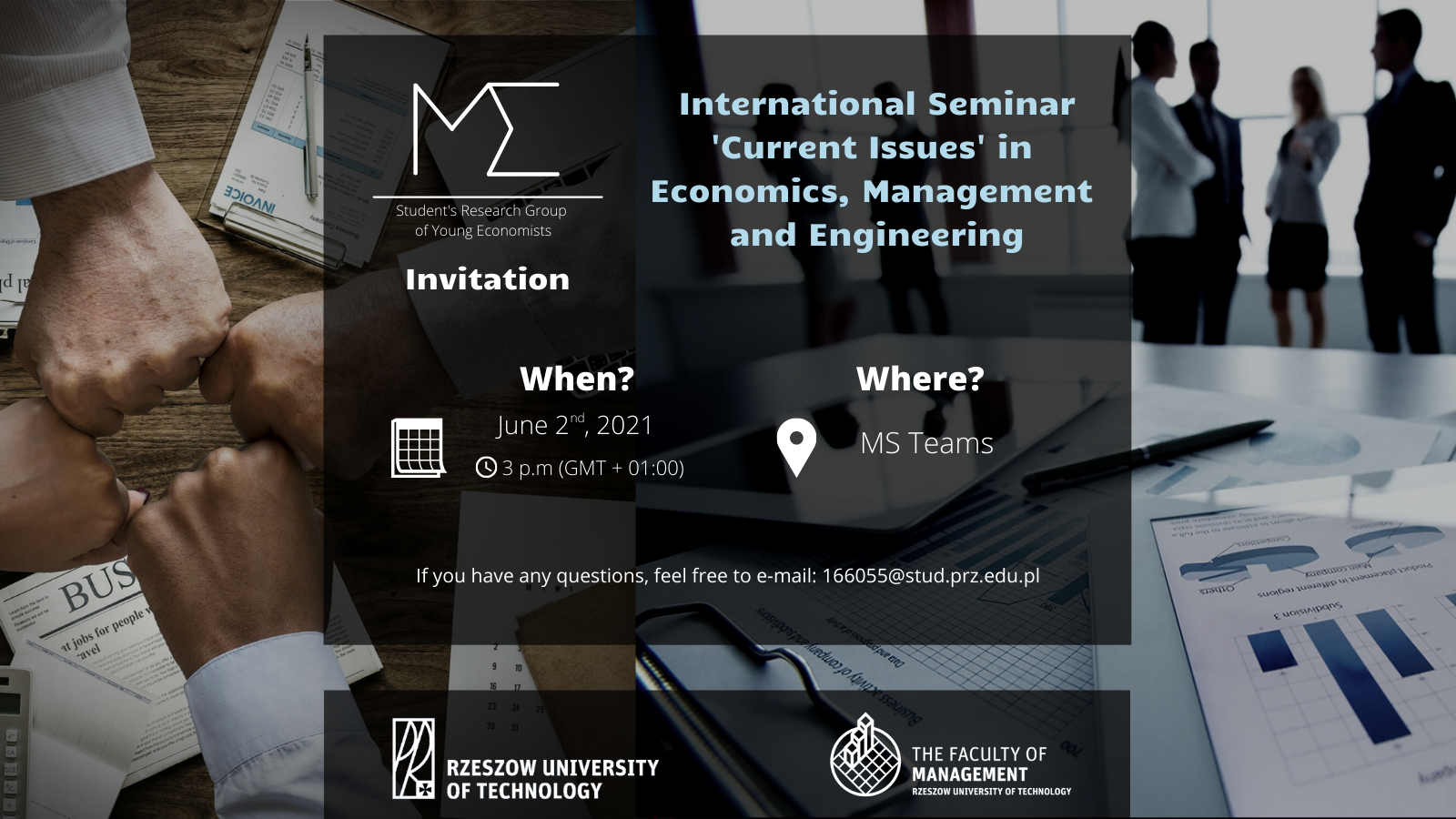 Już dziś (2 czerwca br.) o godz. 15:00 rozpocznie się Międzynarodowe Seminarium „Current Issues” in Economics, Management and Engineering, organizowane przez Studenckie Koło Naukowe Młodych Ekonomistów, działające przy Zakładzie Ekonomii Wydziału Zarządzania Politechniki Rzeszowskiej im. Ignacego Łukasiewicza pod opieką dr Marzeny Hajduk-Stelmachowicz. Wydarzenie odbędzie się  w formie zdalnej za pośrednictwem platformy MS Teams.